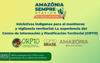 El evento “Iniciativas indígenas para el monitoreo y vigilancia territorial: La experiencia del Centro de Información y Planificación Territorial (CIPTO)” se llevará a cabo el 10 de noviembre de 2025, a las 9:30 horas, en el Museo Paraense Emílio Goeldi, en Belém do Pará, Brasil, como parte de las actividades en la Conferencia de las Partes (COP30) creada por la Convención Marco de las Naciones Unidas sobre el Cambio Climático (UNFCCC, por sus siglas en inglés).